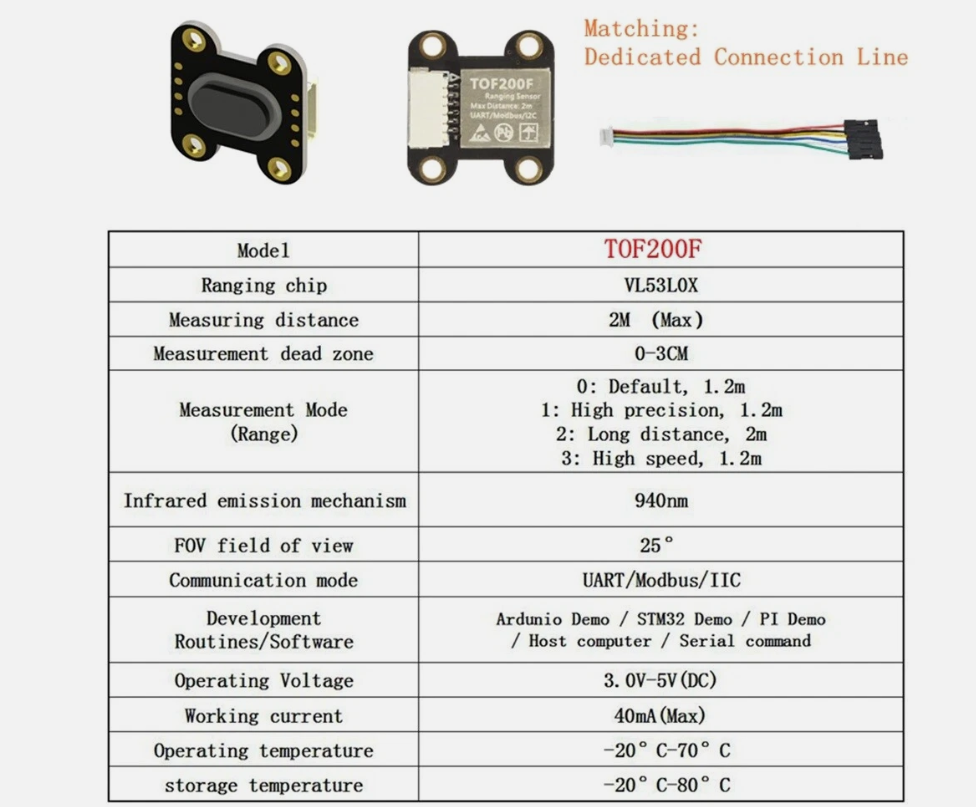 TOF200F là một cảm biến đo khoảng cách tiên tiến sử dụng công nghệ Time of Flight (TOF), giúp đo chính xác khoảng cách lên đến 2 mét bằng tia laser hồng ngoại an toàn cho mắt. Cảm biến phù hợp cho các ứng dụng trong robot tránh vật cản, đo khoảng cách tự động, máy in 3D, thiết bị IoT và nhiều hệ thống tự động hóa khác.