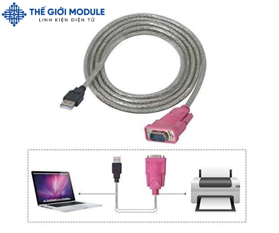 Là cáp chuyển đổi tín hiệu nối tiếp từ cổng USB (PC) sang RS232 để hỗ trợ giao tiếp giữa máy vi tính (không có cổng COM vật lý) với các thiết bị ngoại vi khác như: QR code, PLC, máy in, máy tính tiền...