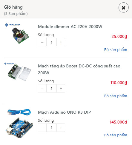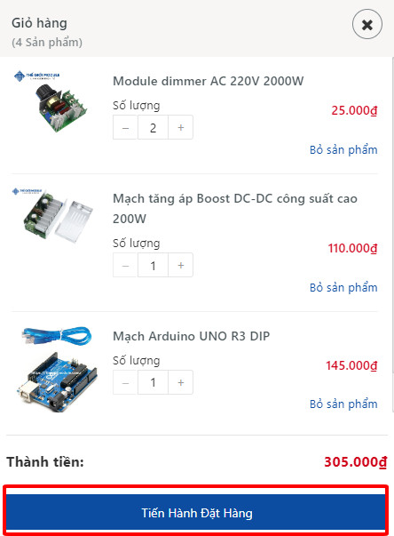 Sau khi đã chọn đủ sản phẩm cần mua, bạn click vào biểu tượng giỏ hàng ở góc phải đầu trang website, kiểm tra và thay đổi số lượng cần đặt