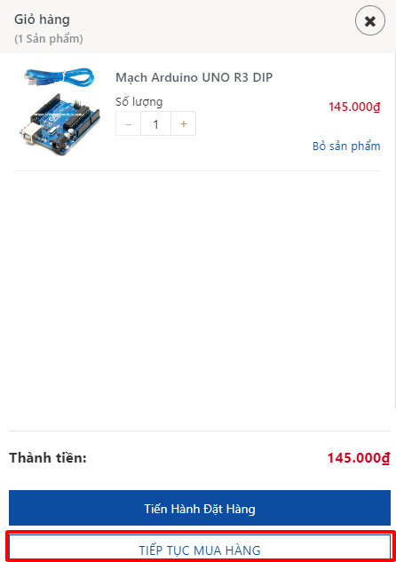 Nếu bạn muốn lựa chọn thêm sản phẩm khác, bấm vào nút TIẾP TỤC MUA HÀNG và thêm các sản phẩm mới vào giỏ hàng của mình