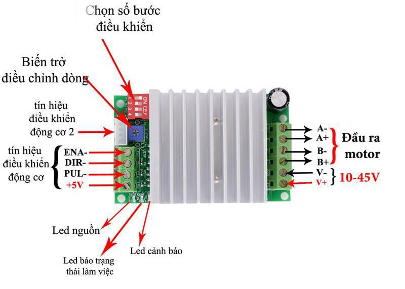 - Chip điều khiển: TB6600 công suất cao, có khả năng tự ngắt khi điện áp thấp, nhiệt độ cao, bảo vệ quá dòng và ngắn mạch