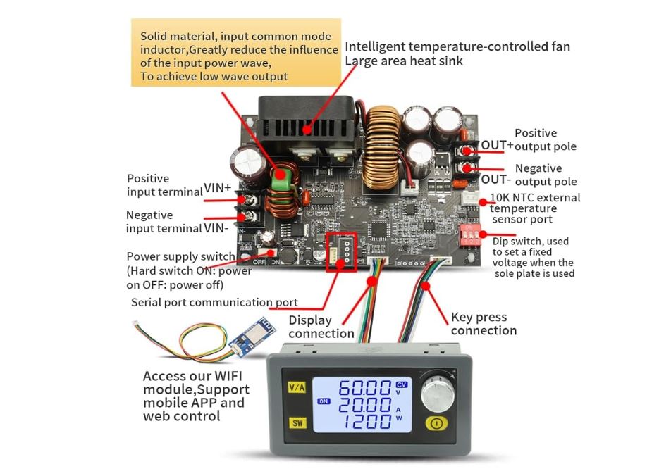 Mạch Giảm Áp Buck DC-DC XY6020L 1200W 20A có màn hình điều khiển có nguồn điện ổn định điện áp và dòng điện không đổi. Màn hình hiển thị lớn, LCD điện chuyên dụng. Sử dụng chất liệu cao cấp, bền bỉ,hiệu suất ổn định,vật liệu rắn, cuộn cảm chế độ chung đầu vào, làm giảm đáng kể tác động của số sóng cung cấp điện đầu vào, để đạt được đầu ra số sóng thấp.