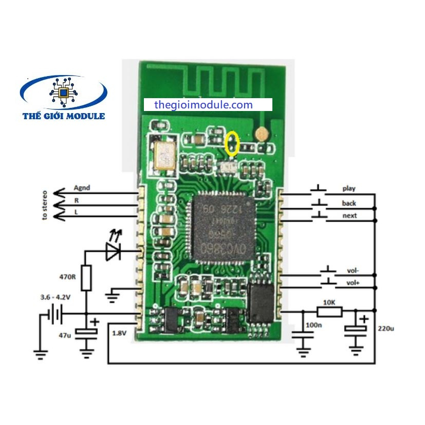 Module bluetooth OVC3860 truyền nhận ở tần số 2.4GHz, chuẩn bluetooth 2.0, 20 bit stereo studio chất lượng cao cùng với chip báo nguồn và bộ sạc cho pin Lithium Ion/Polymer